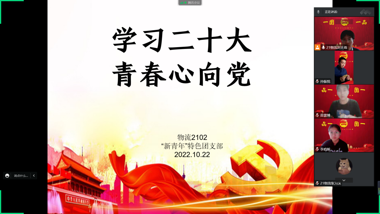 10月16日上午10时,中国共产党第二十次全国代表大会在北京人民大会堂隆重开幕。习近平总书记代表十九届中央委员会向大会作报告。kaiyun开云官方网站21级物流管理02“新青年”理论学习型“一团一品”特色团支部于10月22日下午两点半举办线上专题学习会。