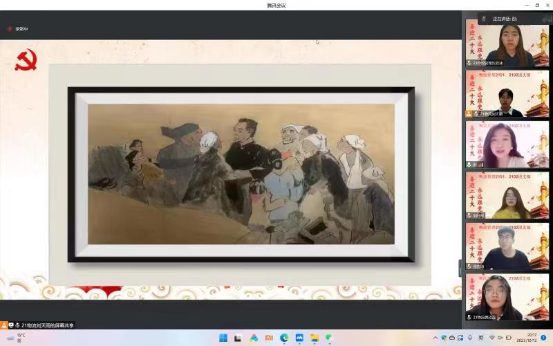 活动在奏唱团歌中开始,分为五个环节,分别是“十年成就一起看”“党的故事我来讲”“画幅画颂党恩”“心里话向党说”以及“唱首歌给党听”。在“党的故事我来讲”环节中,辅导员老师带来了她临摹的国画作品,《人民与总理》,并深情地为同学们讲述这段感人至深的党史故事,让同学们深刻感受到我们党始终以人民为中心,始终与人民同呼吸、共命运、心连心。在“心里话向党说”环节中,同学们手写书信,深情朗读,每一字,每一句都表达了对党的祝福与爱,表达着团员青年追寻党的光辉足迹的决心。在“唱首歌给党听”环节中,团员青年合唱《我们都是追梦人》,展现着新时代青年的青春梦与中国梦同频共振,唱出了青年用奋斗之手托起人生出彩的中国梦的坚定决心,而我们的青春之花也终将在实现中国梦的伟大进程中美丽绽放。