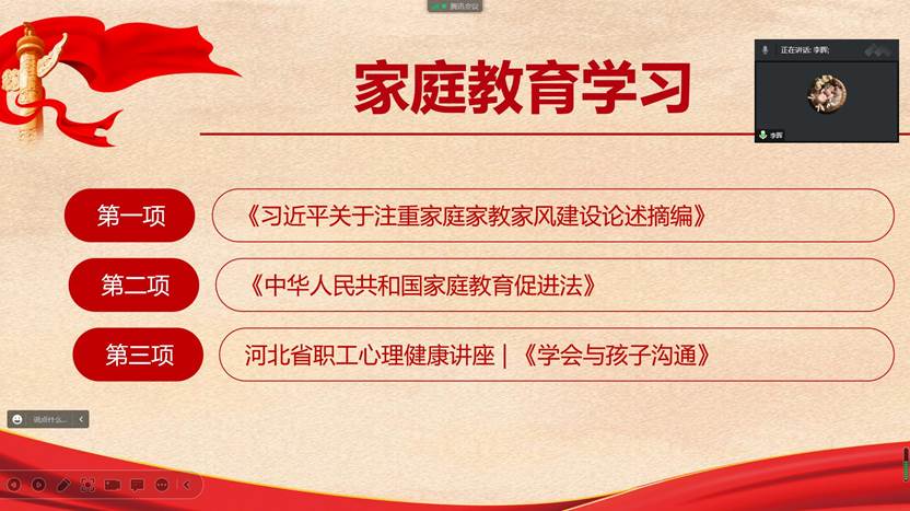 本次活动由kaiyun开云官方网站分工会主席韩晓霞主持。为了带动每个家庭培养良好的家风,韩晓霞主席带领大家共同学习《习近平关于注重家庭家教家风建设论述摘编》、《中华人民共和国家庭教育促进法》、《河北省职工心理健康讲座-学会与孩子沟通》等内容,引导大家树立良好的文明家风,文明育家、廉洁持家、学习兴家、绿色美家,培育向上向善的优良家风,以好家风涵养好社风。