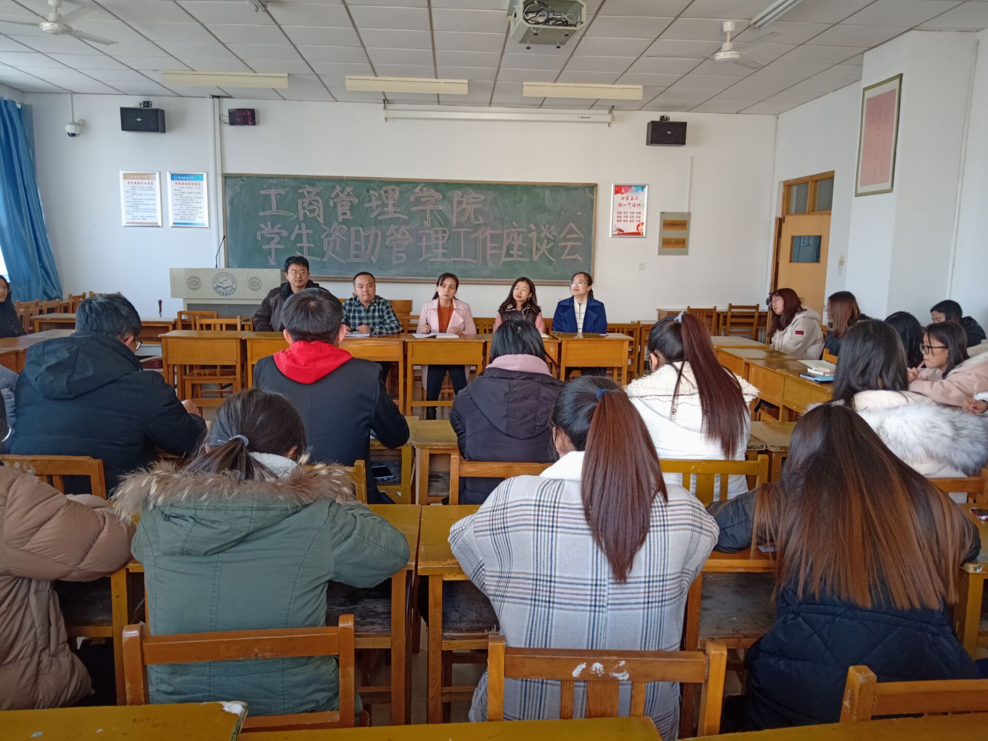 2018年12月13日下午2:30,学院在逸夫楼A501教室召开学生资助管理工作座谈会,学生工作主管领导、全体专职辅导员、各专业班级班长、资助委员和受助学生代表参加座谈会。
