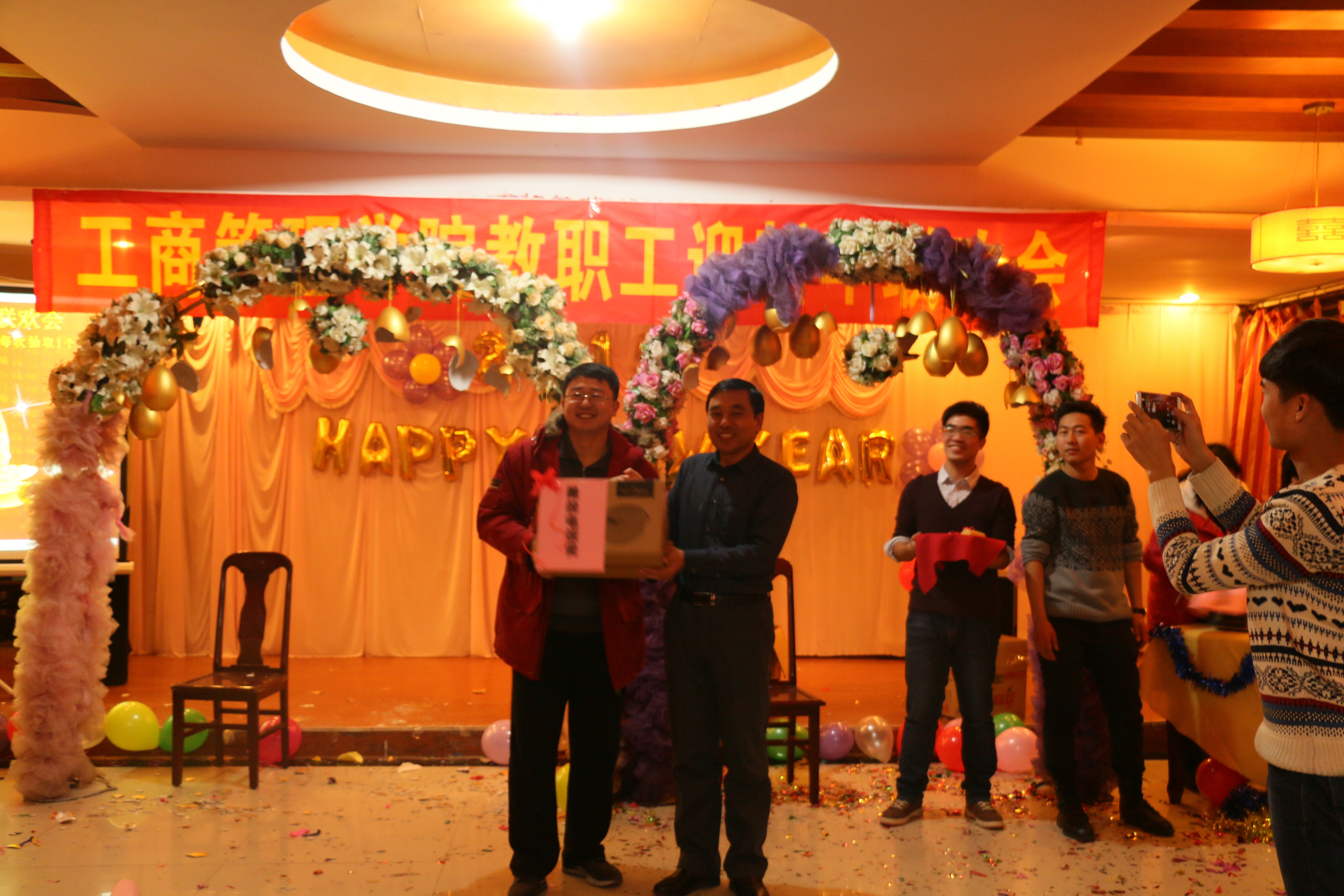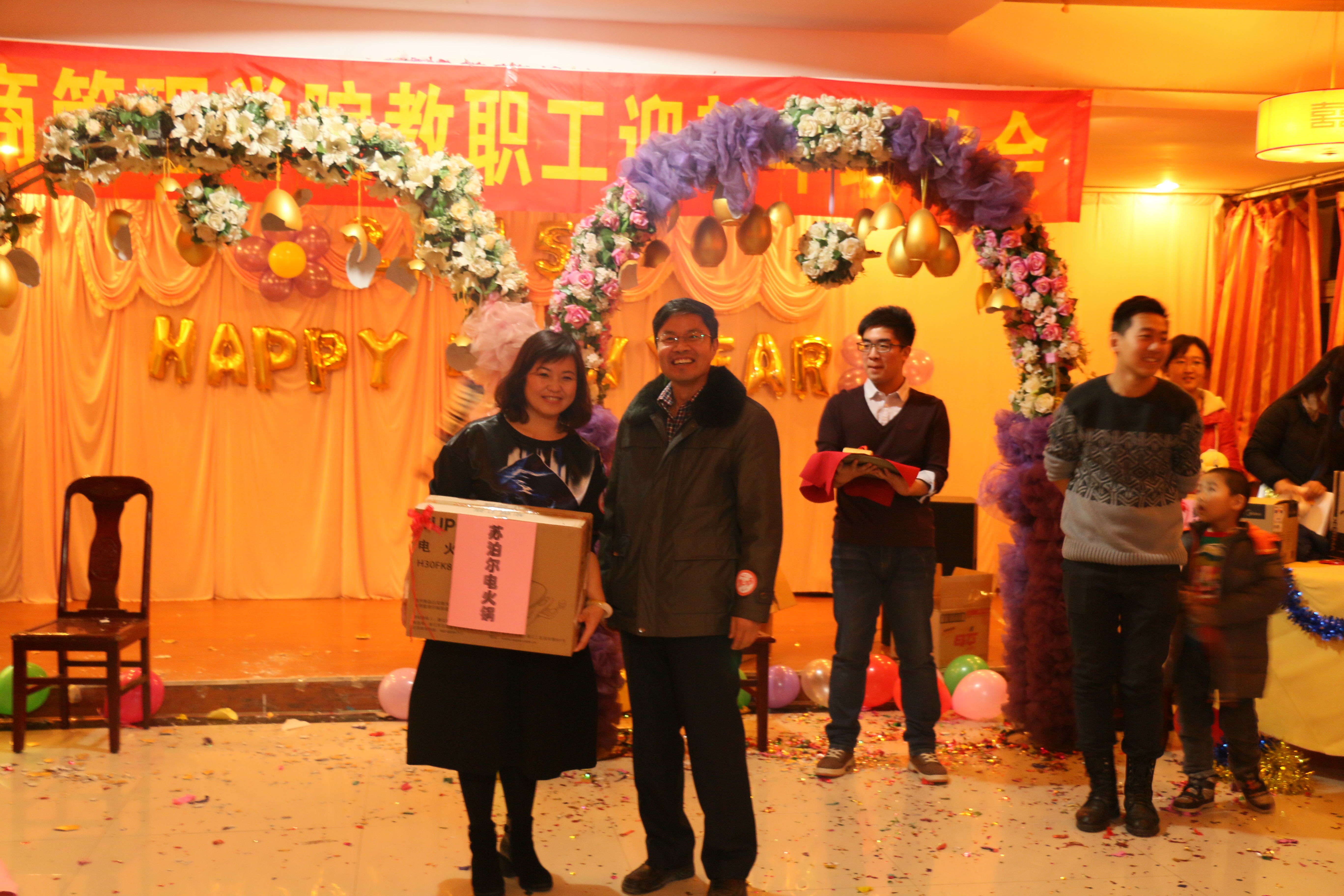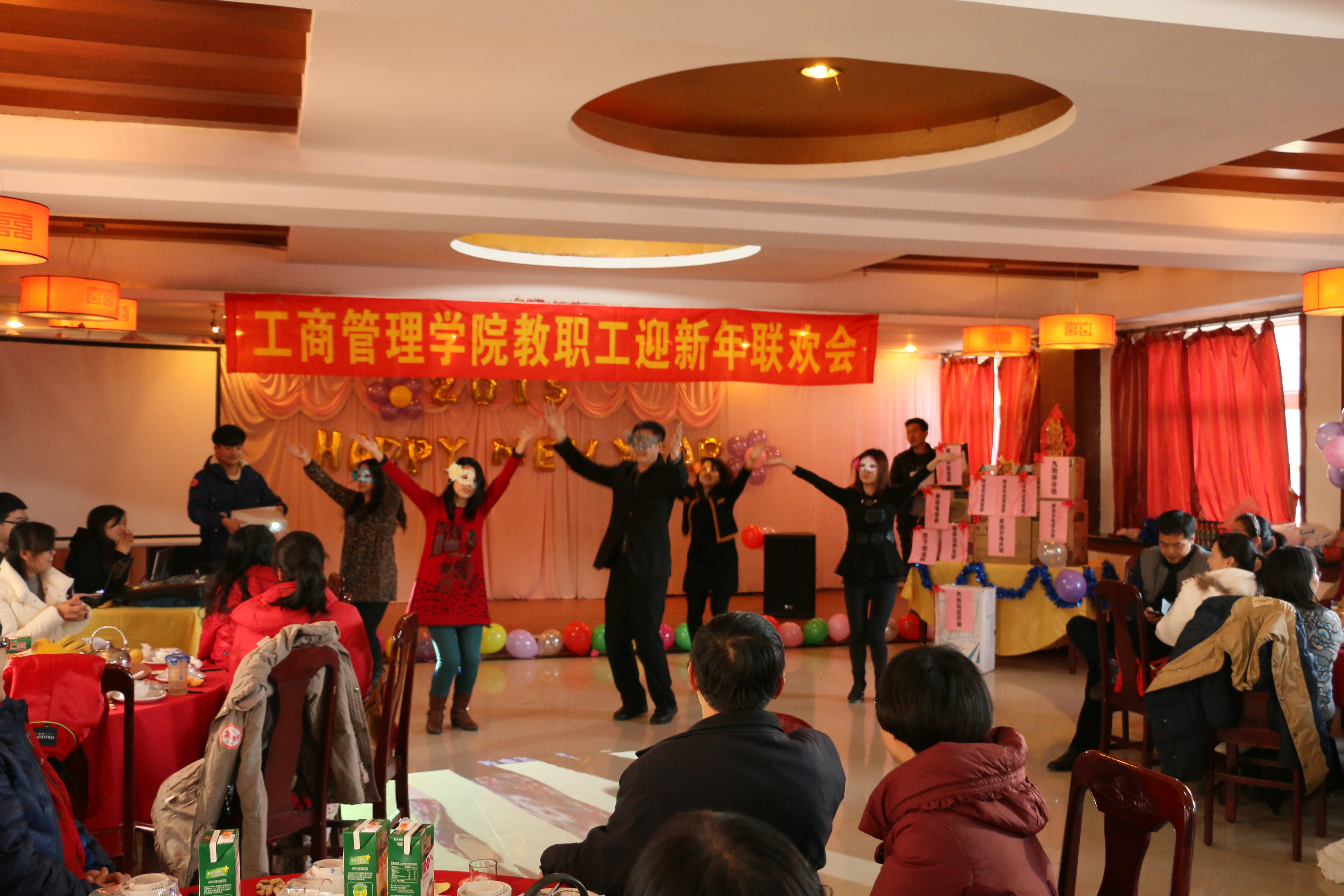2014年12月25日15:30,2015年新年联欢会在学院党委书记侯金柱教授的新年致辞中拉开帷幕。本场联欢会不仅有各位教师精心准备的精彩节目,还有趣味十足的游戏,更有让人心动的幸运砸金蛋抽奖时刻,可谓异彩纷呈。主持人幽默生动的语言、老师们惟妙惟肖的表演、现场观众火爆的热情,整场联欢会热闹非凡。旅游教学部的舞蹈《倍爽》、人资教学部《感恩的心》、市场营销教学部的戏曲联唱、信息教学部的合唱《小苹果》、基础教学部的《大海啊故乡》、物流管理教学部的《今夜无眠》,还有魔术、独唱、交谊舞等精彩的节目将老师们的多才多艺表现的淋漓尽致。最后的“幸运砸金蛋”更带动了晚会活跃的气氛,紧张且充满期待的抽奖,掀起了晚会的高潮!