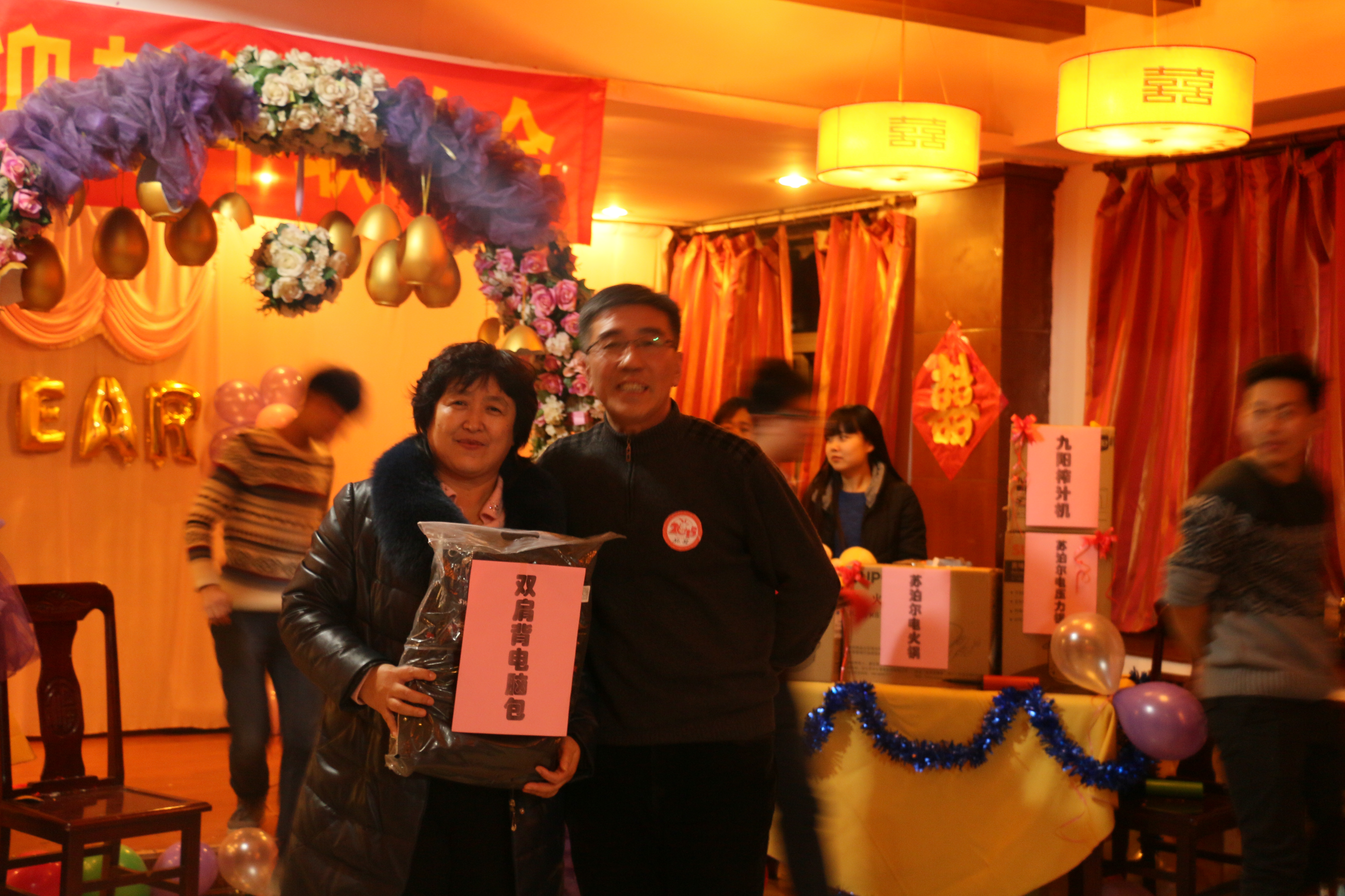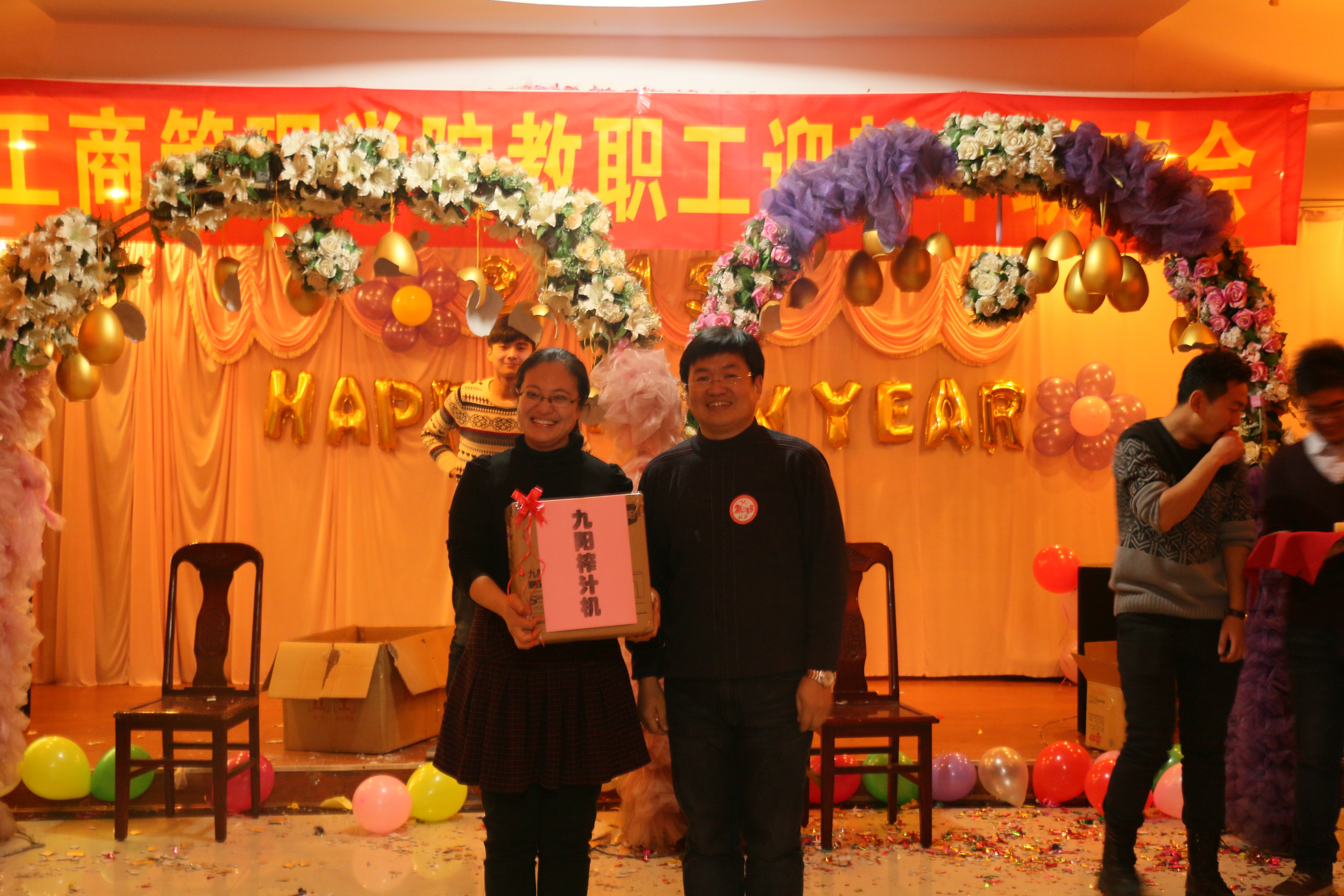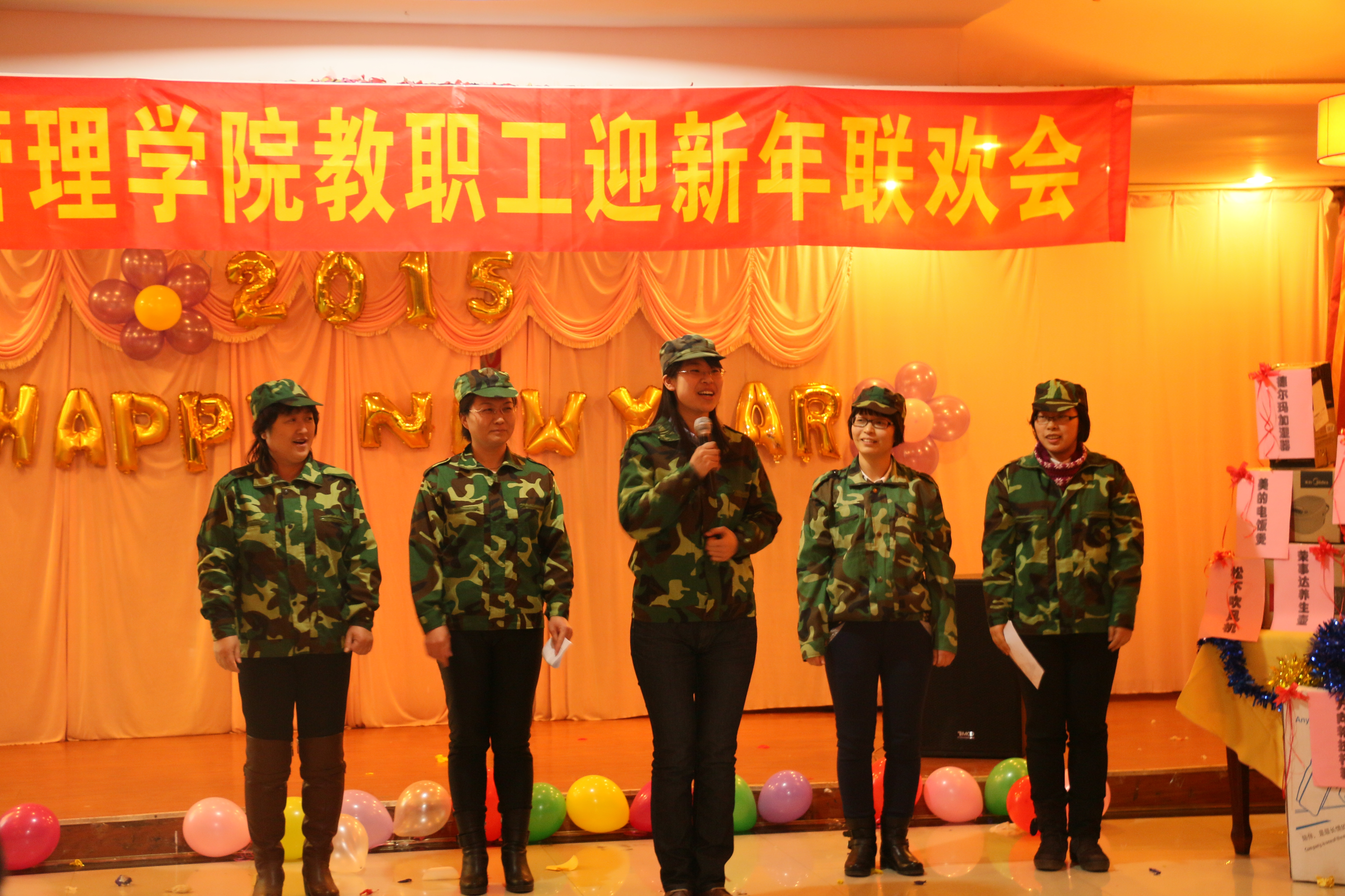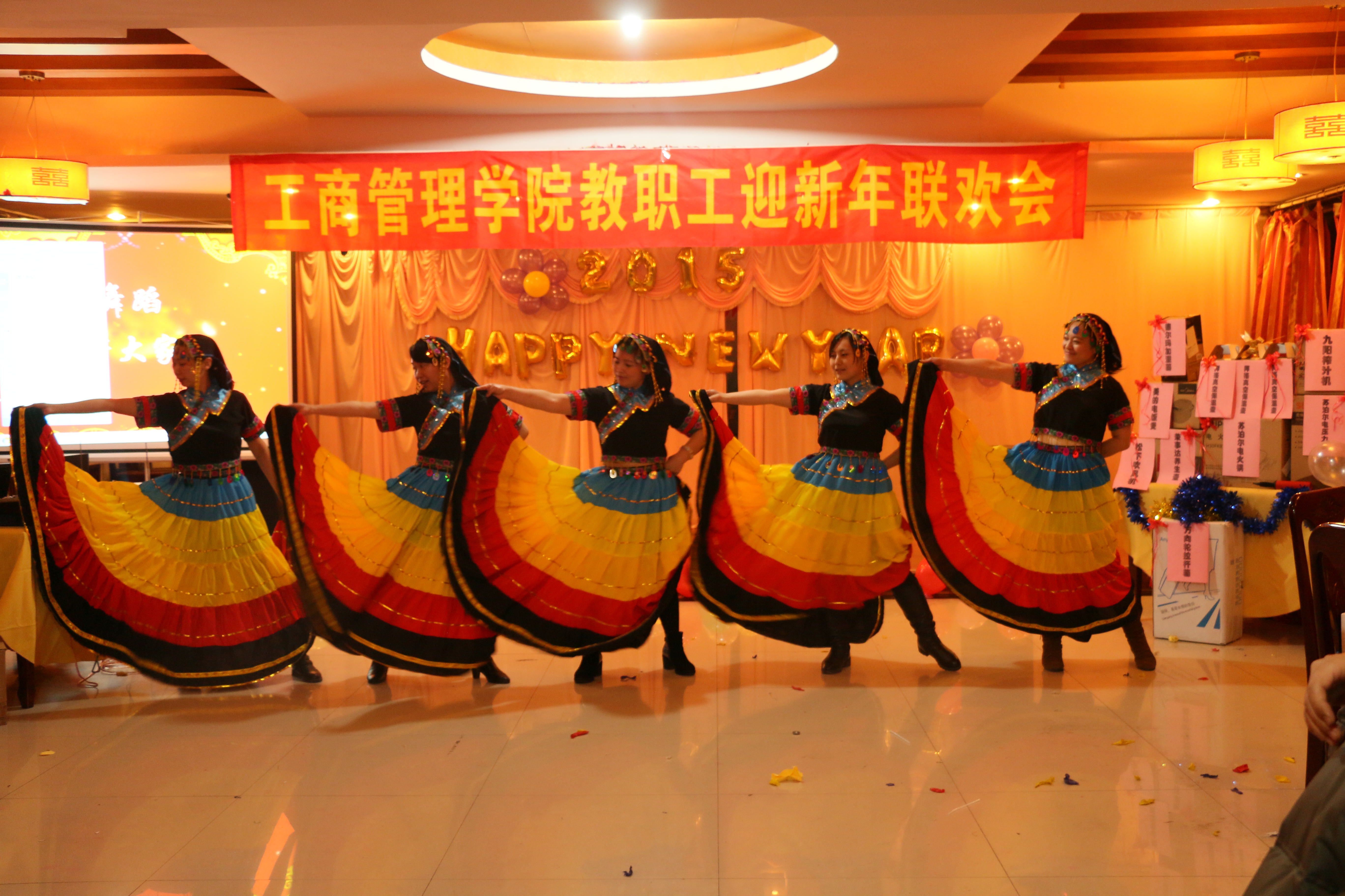 2014年12月25日15:30,2015年新年联欢会在学院党委书记侯金柱教授的新年致辞中拉开帷幕。本场联欢会不仅有各位教师精心准备的精彩节目,还有趣味十足的游戏,更有让人心动的幸运砸金蛋抽奖时刻,可谓异彩纷呈。主持人幽默生动的语言、老师们惟妙惟肖的表演、现场观众火爆的热情,整场联欢会热闹非凡。旅游教学部的舞蹈《倍爽》、人资教学部《感恩的心》、市场营销教学部的戏曲联唱、信息教学部的合唱《小苹果》、基础教学部的《大海啊故乡》、物流管理教学部的《今夜无眠》,还有魔术、独唱、交谊舞等精彩的节目将老师们的多才多艺表现的淋漓尽致。最后的“幸运砸金蛋”更带动了晚会活跃的气氛,紧张且充满期待的抽奖,掀起了晚会的高潮!
