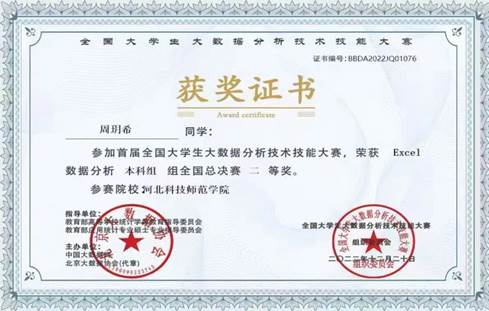 该项比赛是在教育部高等学校统计学类教育指导委员会、教育部应用统计专业硕士专业指导委员会的共同指导下,由中国大数据网联合北京大数据协会联合启动。大赛包括Excel数据分析和Python数据分析两项赛项,周玥希、高丽丽两位同学在2022年11月举行的该项大赛省赛中获得一等奖,取得了参加全国赛的资格。现代表开云官网在该项大赛全国总决赛中取得佳绩,可喜可贺。(撰稿人:柴朝华,审核人:刘海滨)