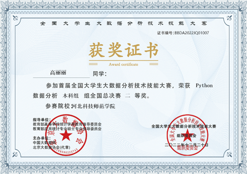 kaiyun开云官方网站信息专业周玥希、高丽丽两位同学在首届全国大学生大数据分析技术技能大赛全国总决赛中积极备赛、努力拼搏,均获得了该项大赛全国总决赛二等奖。